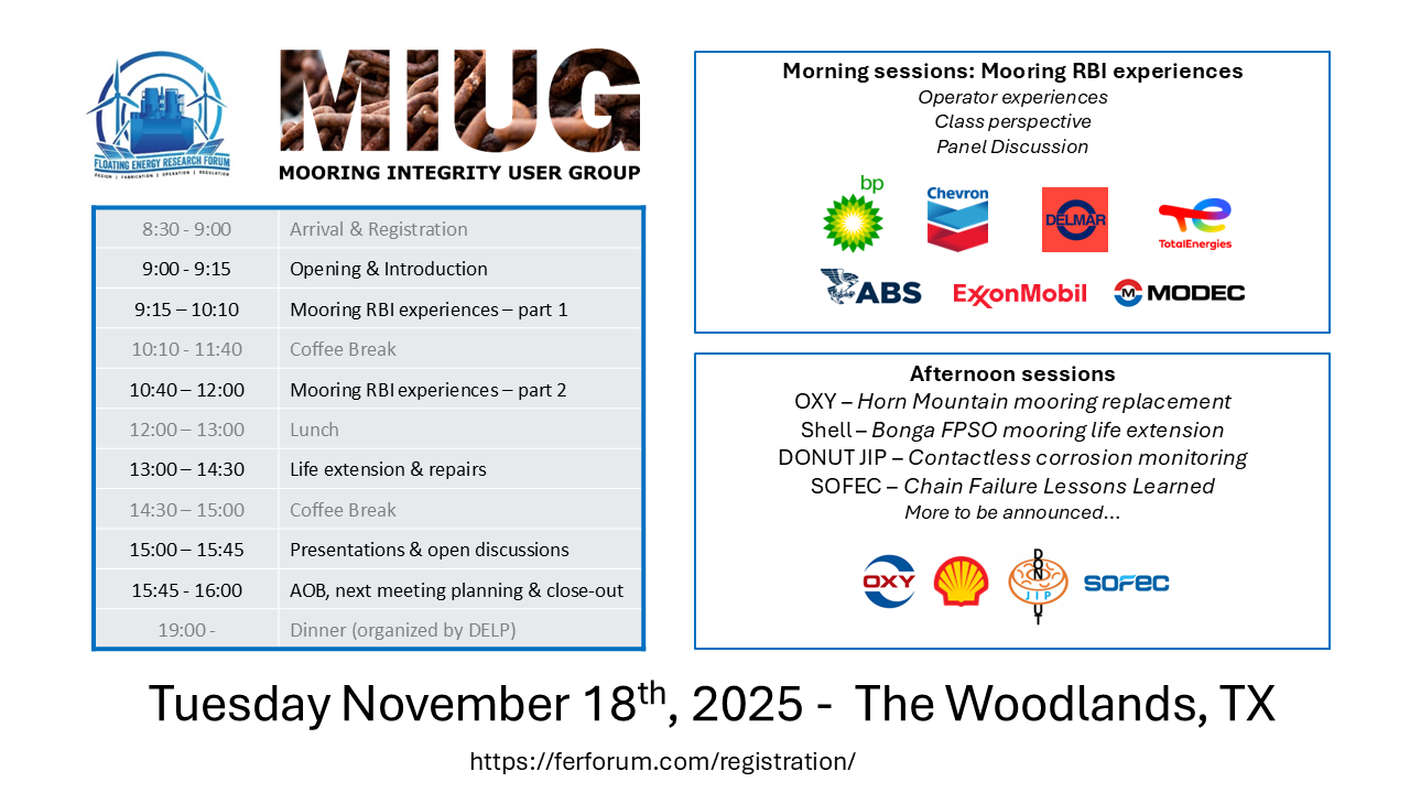The Mooring Integrity User Group (MIUG) is an open, informal, one-day forum dedicated to sharing lessons learned in mooring integrity – good and bad. It addresses all aspects of the mooring life-cycle, from design, manufacturing, installation, operations all the way through decommissioning, and anything that touches on it. The typical focus is on permanent offshore mooring systems with anchor legs (oil & gas, and FOWT), but shallow water solutions, and jetty-type moorings are sometimes addressed as well.